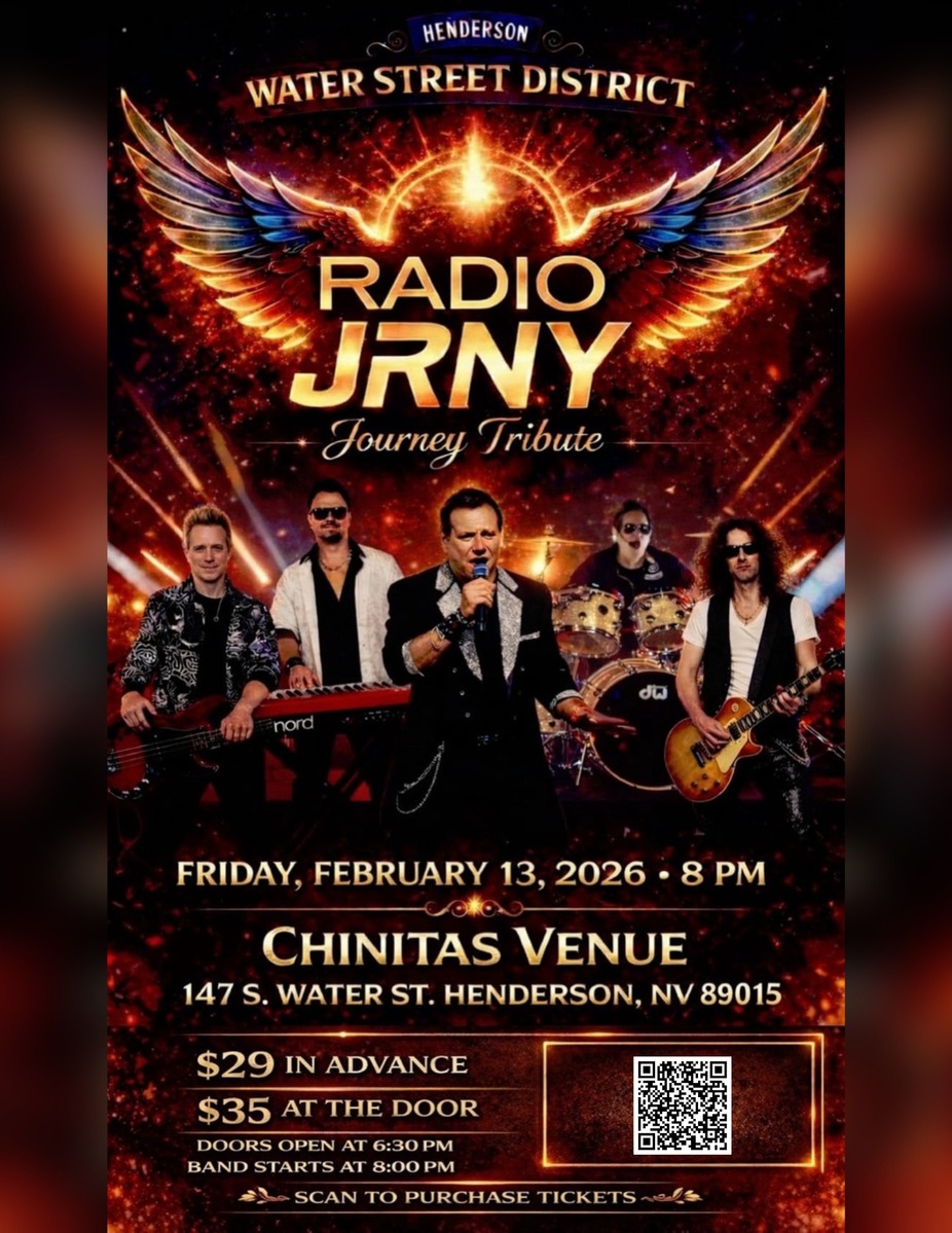 Get ready for an unforgettable night of classic rock as Radio JRNY, the ultimate Journey tribute band, takes the stage at Chinitas Venue in the Henderson Water Street District. Experience the legendary sound, powerhouse vocals, and iconic hits that defined a generation—performed live with the energy and precision true Journey fans love.