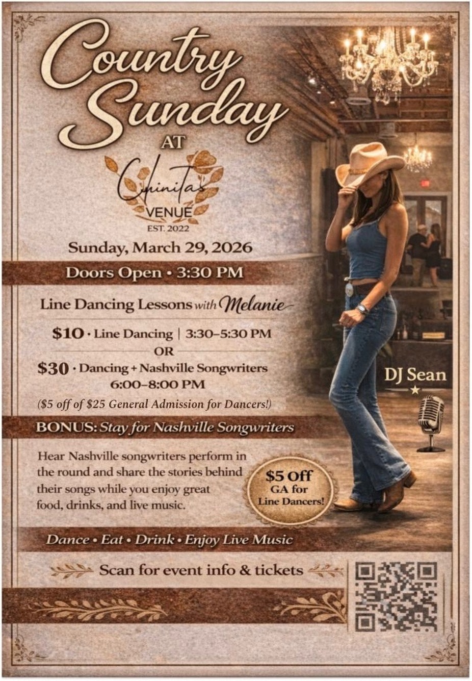 Join us for a fantastic afternoon filled with high-energy country line dancing, followed by an intimate "Songwriters in the Round" experience featuring: